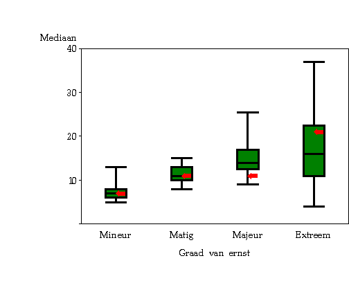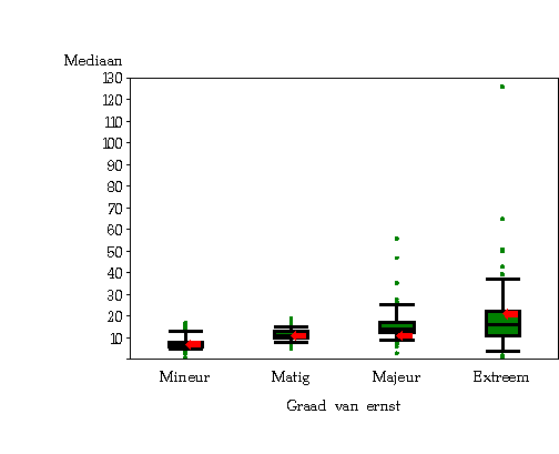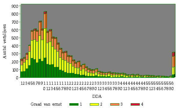 Graad van ernst NAB GEMID. DDA P5 P25 P50 P75 P95 P75-P25 P95-P5 Mineur 7865 11,8 2,3 6,0 9,2 14,7 28,6 8,7 26,3 Matig 7467 16,7 3,1 8,0 12,7 20,3 42,5 12,3 39,4 Majeur 3890 20,7 3,3 9,0 14,9 25,0 56,3 14,0 53,0 Extreem 744 26,3 1,3 7,7 16,6 31,4 82,3 23,7 81,0 TOTAAL 19966 15,9 Met de graad van ernst neemt het gemiddelde en de mediaan (p50) toe, maar vooral de toename van de spreiding valt op. Voor de graad van ernst "mineur" bevindt 50 % van de verblijven (tussen P25 en P75) zich tussen 6 DDA en 14,7 DDA, of een spreiding van 8,7 DDA. Voor de graad van ernst "extreem" bevindt 50 % van de verblijven zich tussen 7,7 DDA en 31,4 DDA, of een spreiding van 23,7 DDA.