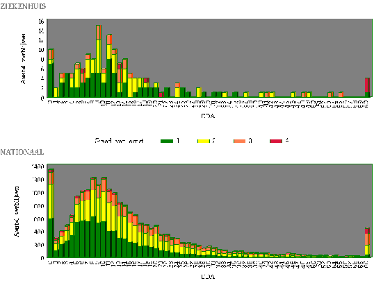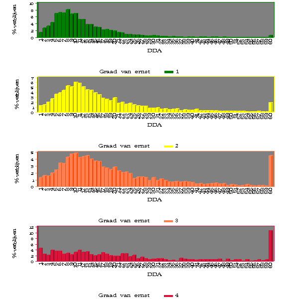 Deze grafieken geven het aantal verblijven weer waarbij de patiënt een bepaald aantal DDA's aan antibiotica gekregen heeft. De kleuren geven de graad van ernst weer: groen = 1 mineur, geel = 2 matig, oranje = 3 majeur, rood = 4 extreem